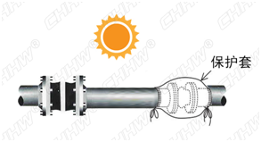 六、與戶外管道安裝時,為防止老化,可以給撓性單球體橡膠接頭套上保護套。(如下圖)