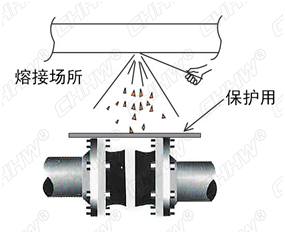 五、安裝完成后,如在產(chǎn)品附近,進行焊接或焊割的話,請用板材或布料蓋住產(chǎn)品以免濺到火花。如有焊接或焊割引起的傳熱危險,請采取把撓性單球體橡膠接頭從管道上坼下來等應(yīng)對措施。(如下圖)